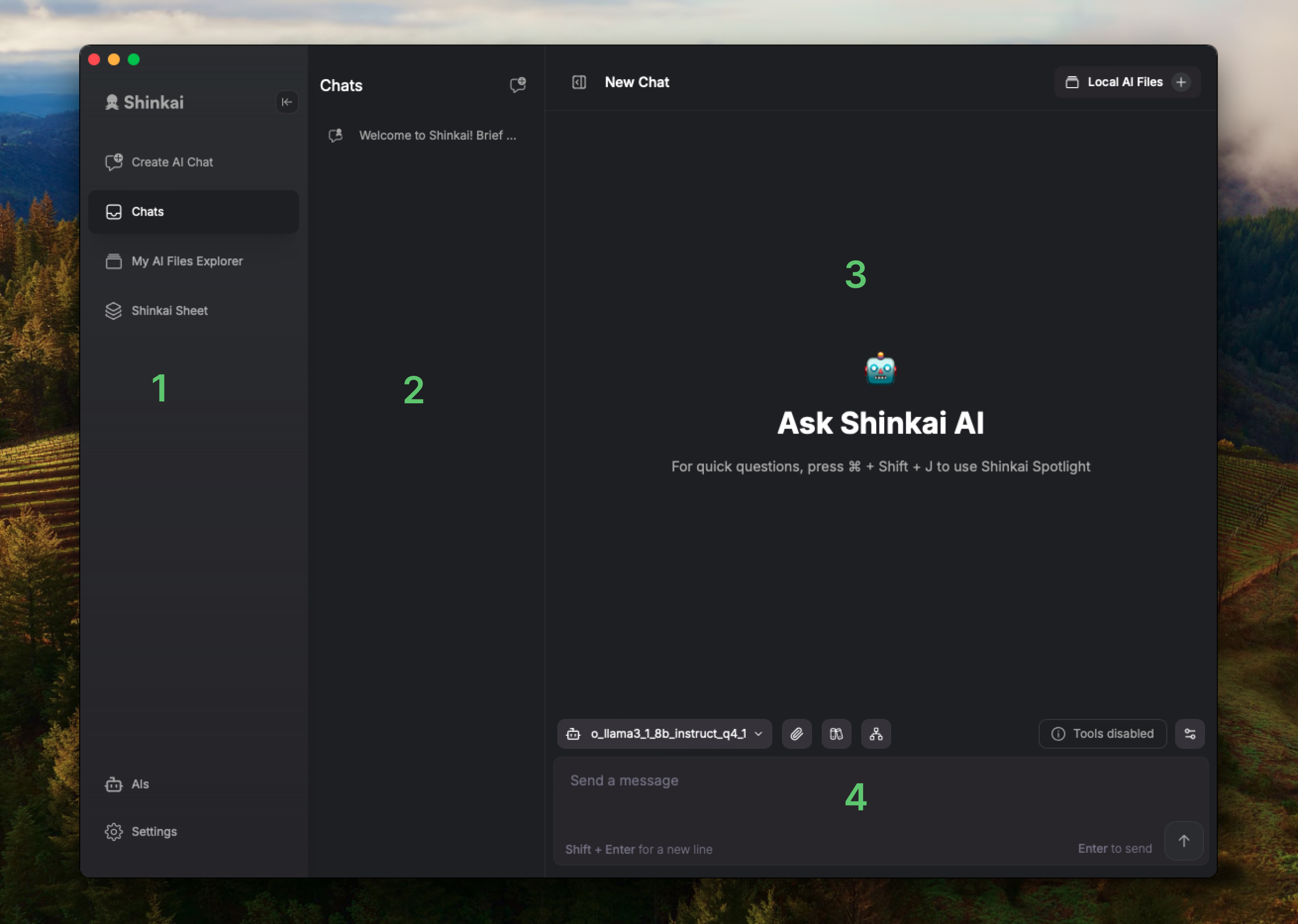 The default view when you opening Shinkai Desktop is the Chats view. Here you can see four main sections in your app.